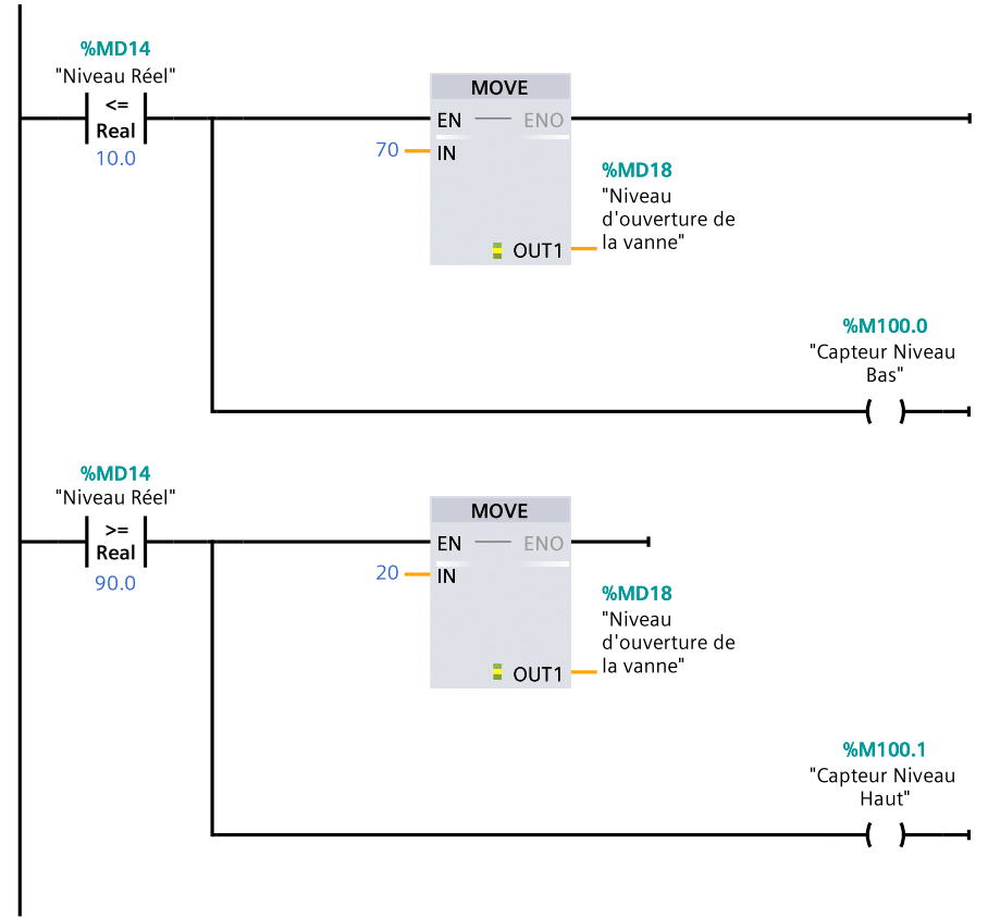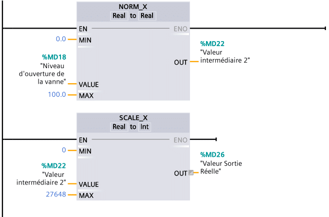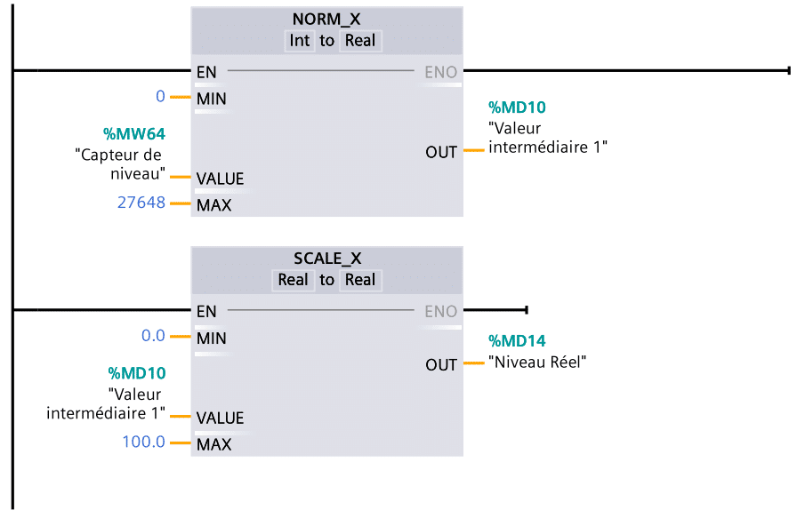 Pour la lecture des valeurs analogiques à l’entrée, par exemple via un capteur de niveau, et à la sortie, pour contrôler une vanne, l’utilisation des blocs Normex et Scale X dans TIA Portal est primordiale (selon la gamme de l’API S71200 ou S71500).